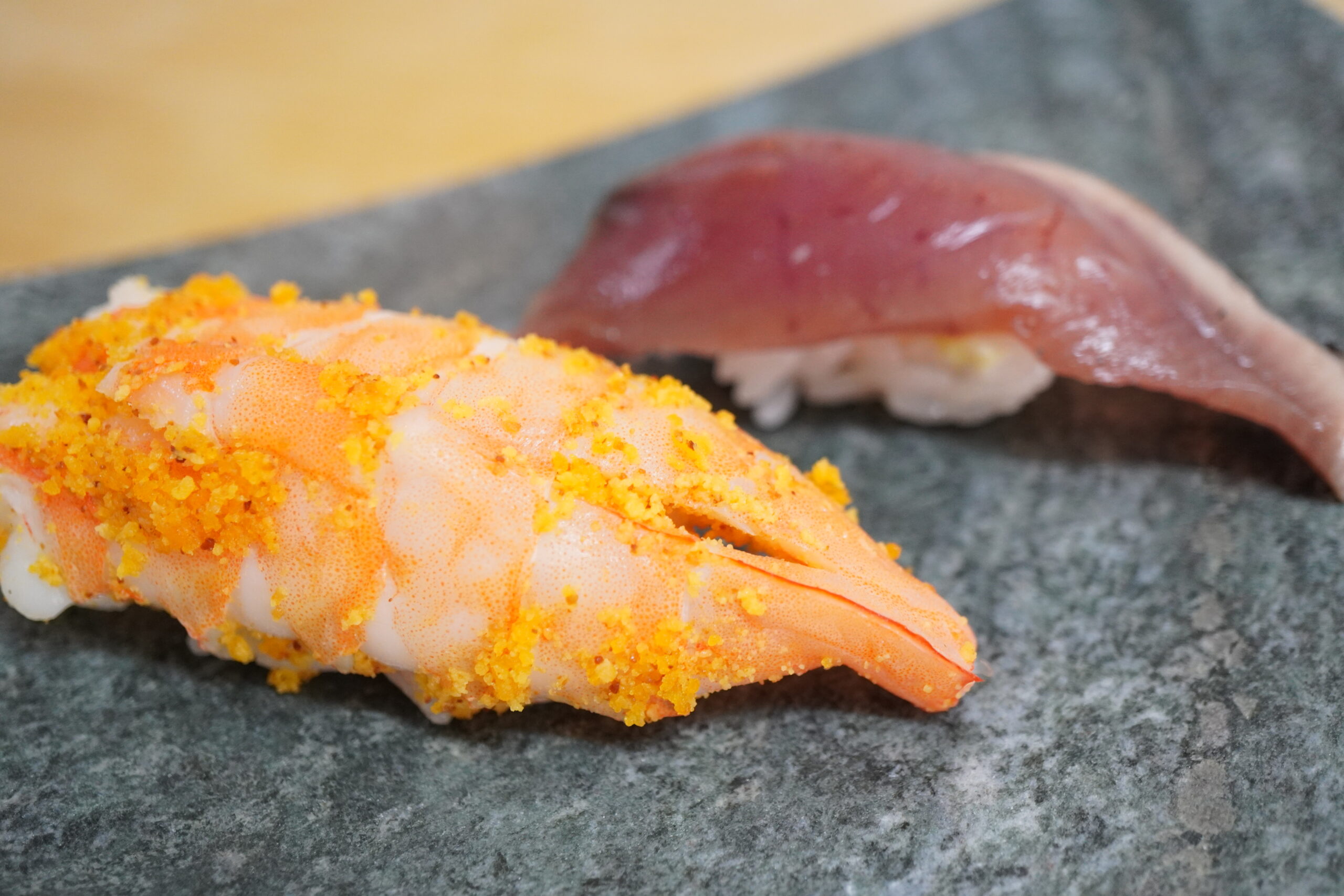 海老は、まず形を整えるところから丁寧に。背を整え、指の腹でそっと丸みを作り、シャリに寄り添わせるように置いていきます。押しつけるのではなく、やさしく包むように扱うことで、自然と美しい握りに仕上がっていきます。